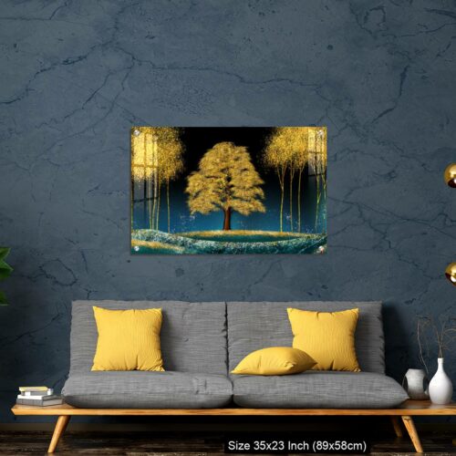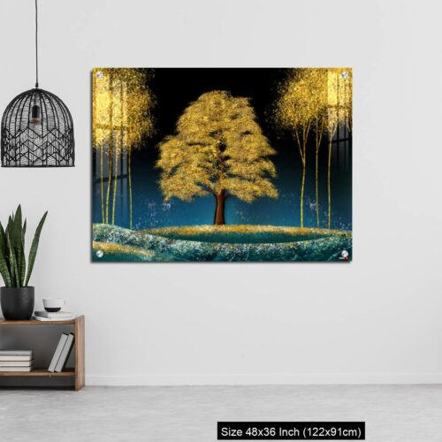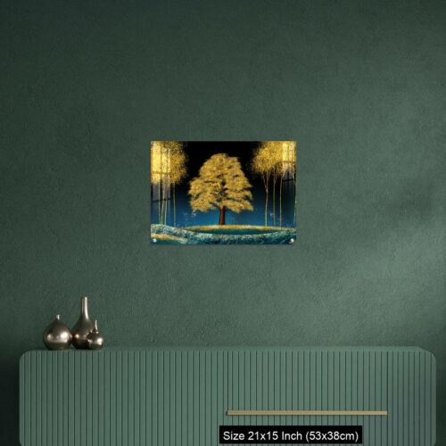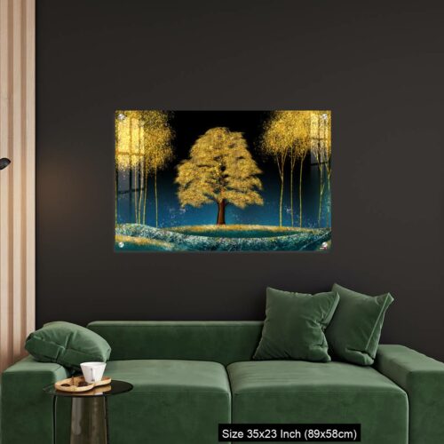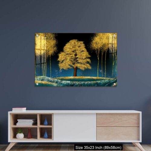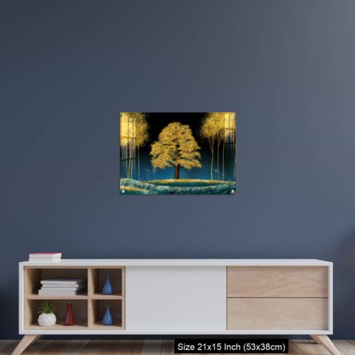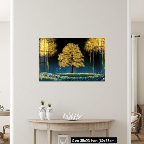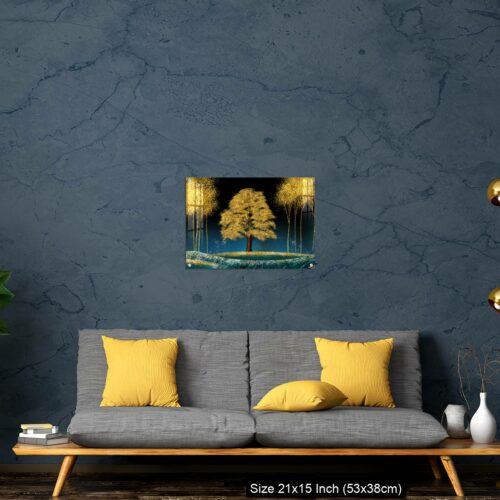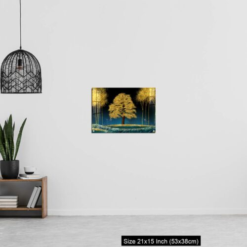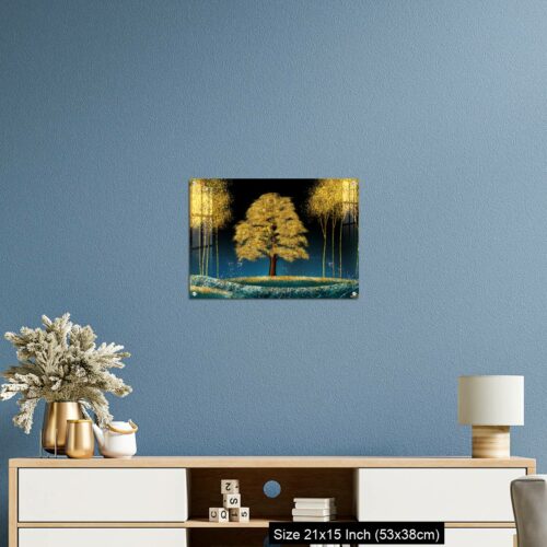 Acrylic Wall Decor – Modern canvas art mural wallpaper landscape moon, golden christmas trees, colorful mountains