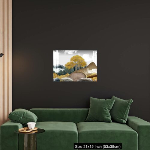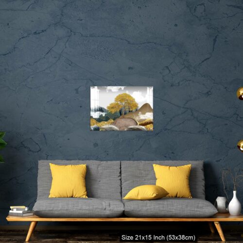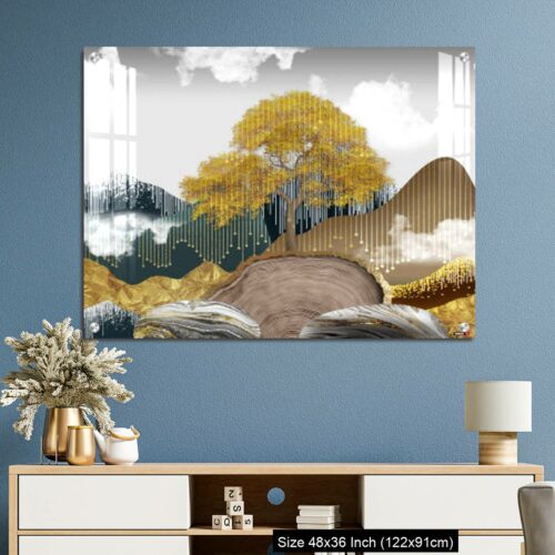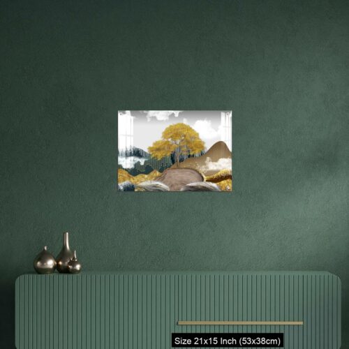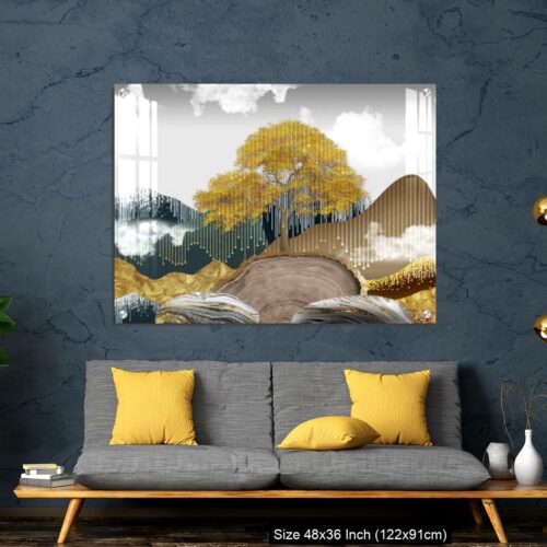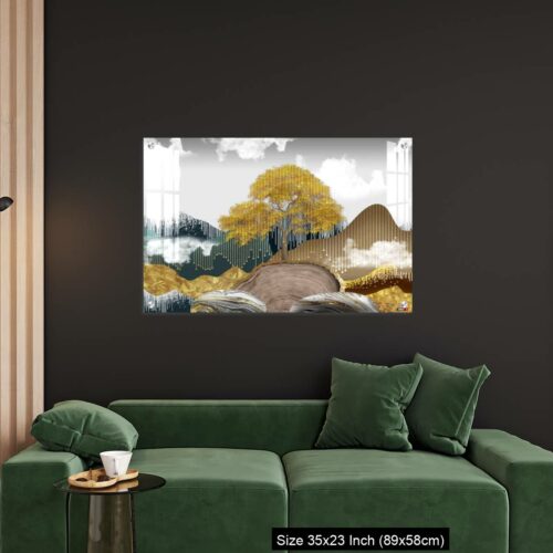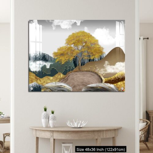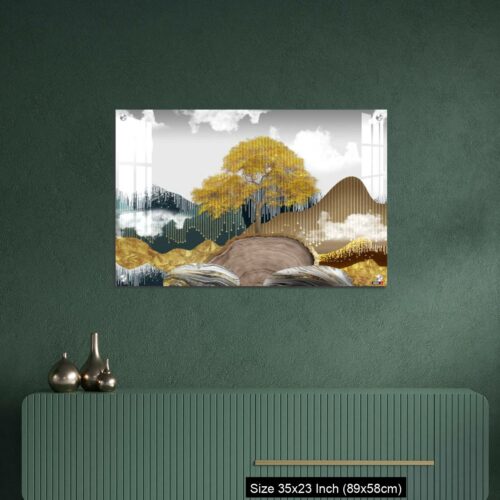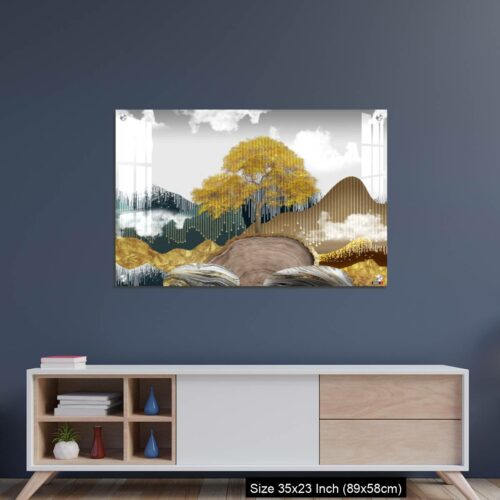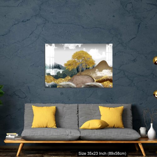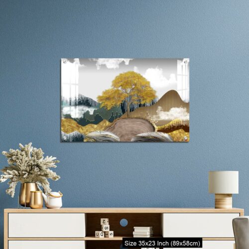 OMGs® Acrylic Wall Decor – Gray background with golden trees, deer, mountains, and white clouds. golden, black, turquoise stone in water.