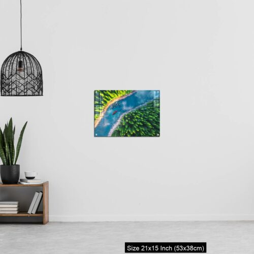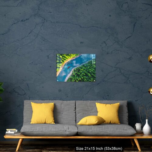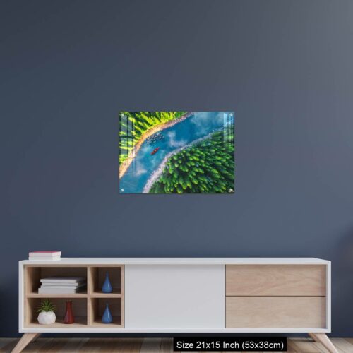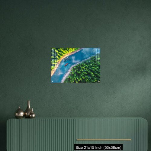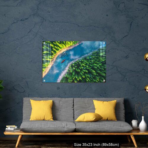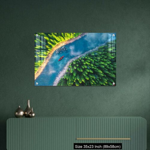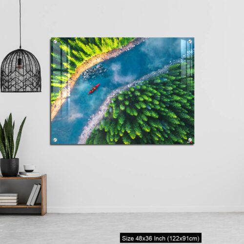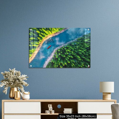 Acrylic Wall Decor – Aerial view of rafting boat or canoe in mountain river and forest.