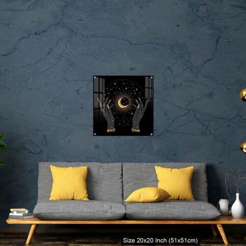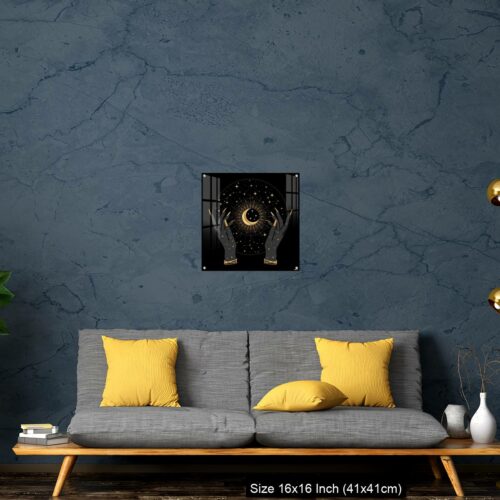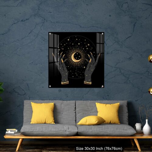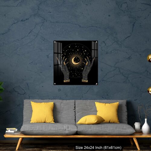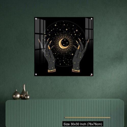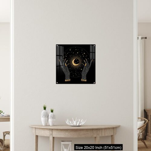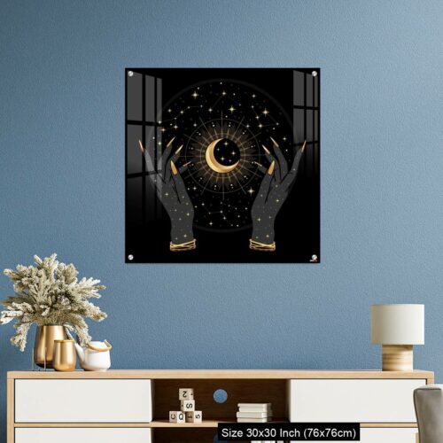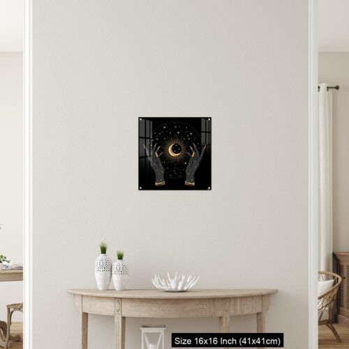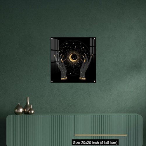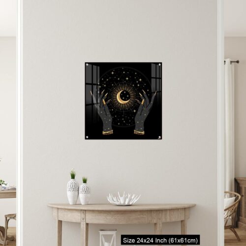 Acrylic Wall Decor – Black and gold boho crescent and elegant female hands.