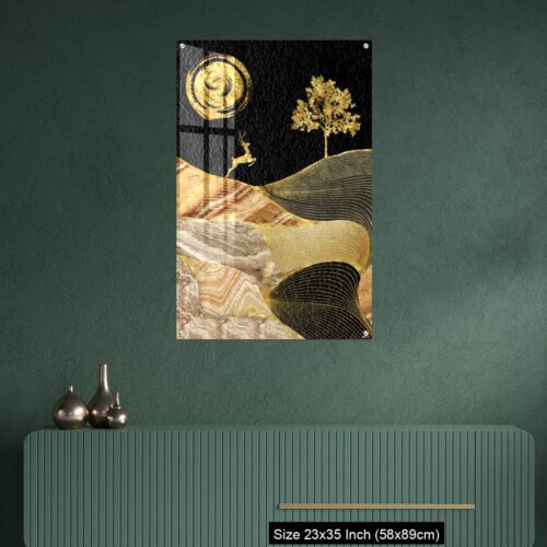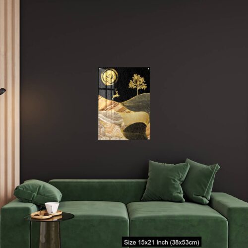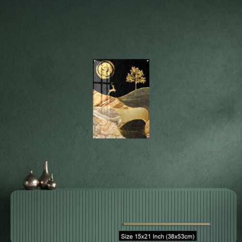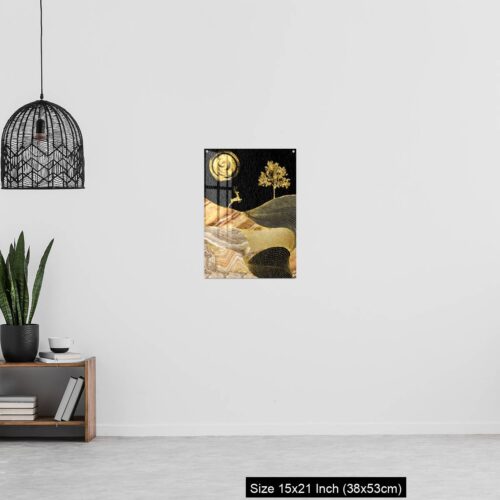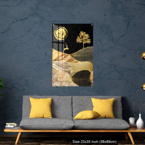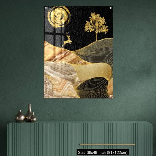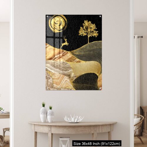 Acrylic Wall Decor – Canvas wall art decor. black and golden background with Ginko leaves and deer.