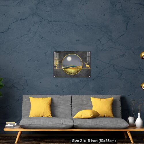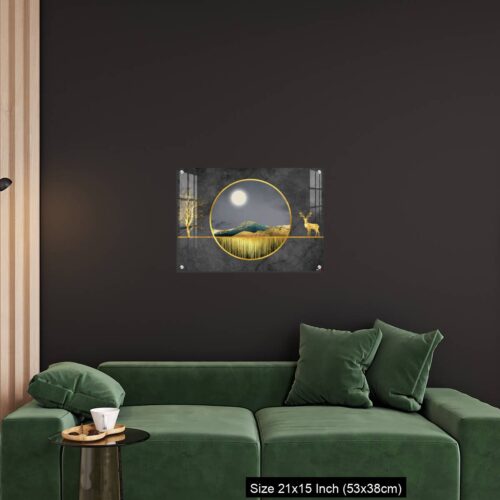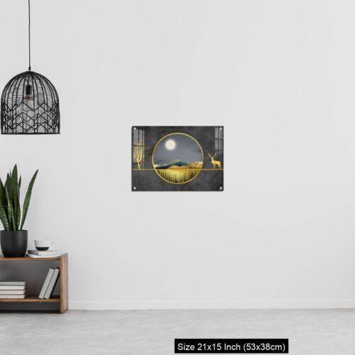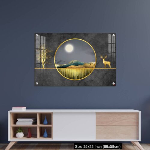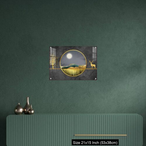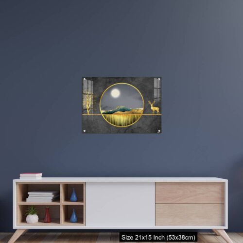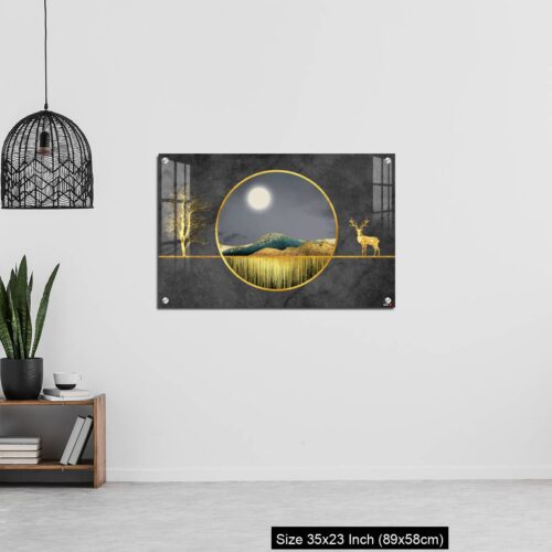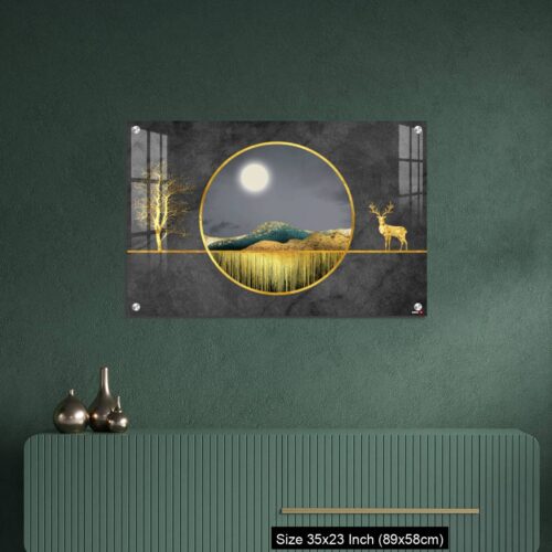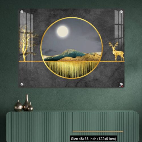 Acrylic Wall Decor – Colorful mountains, golden deer, golden trees, and golden lines.