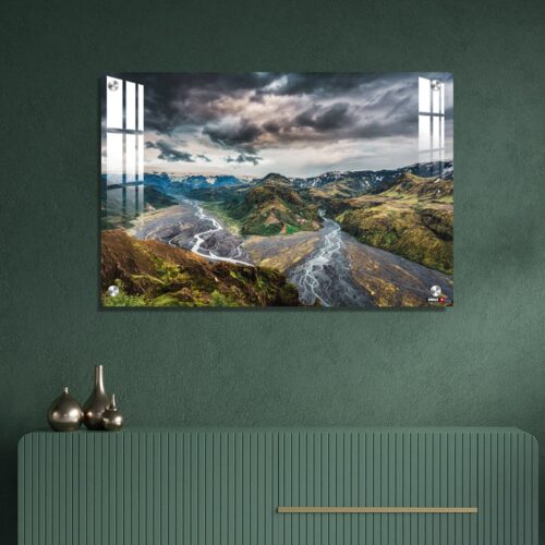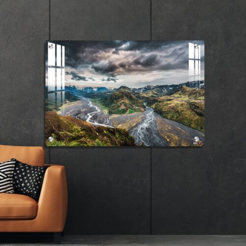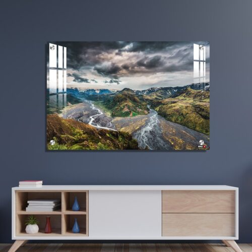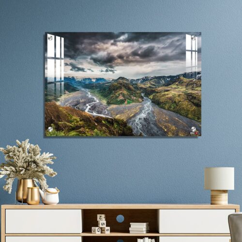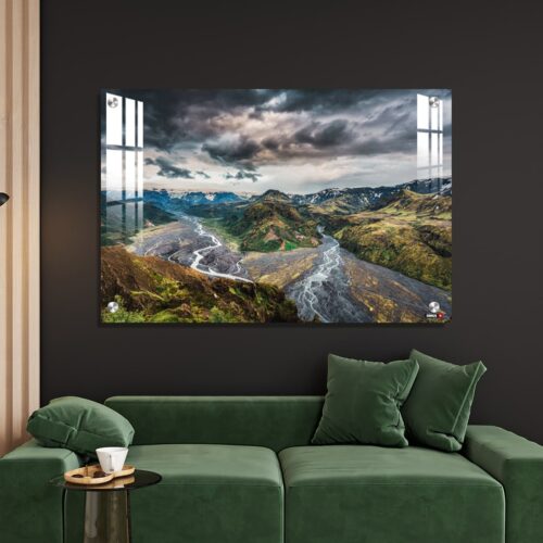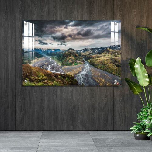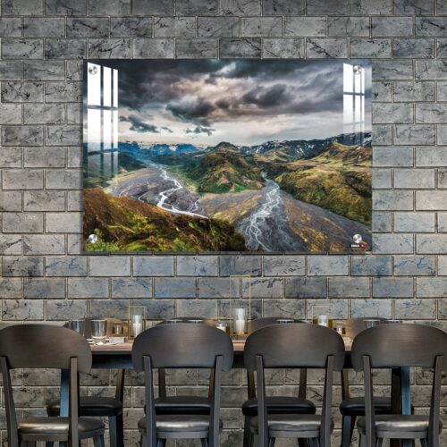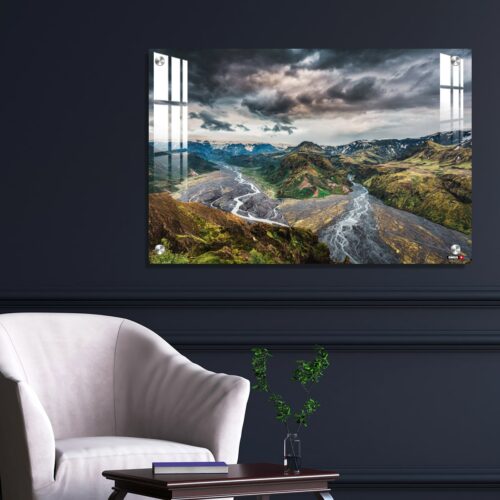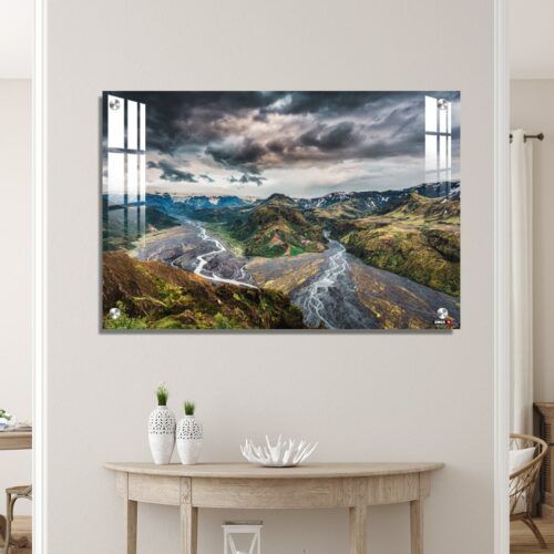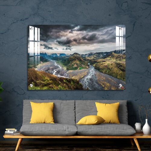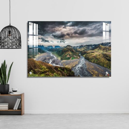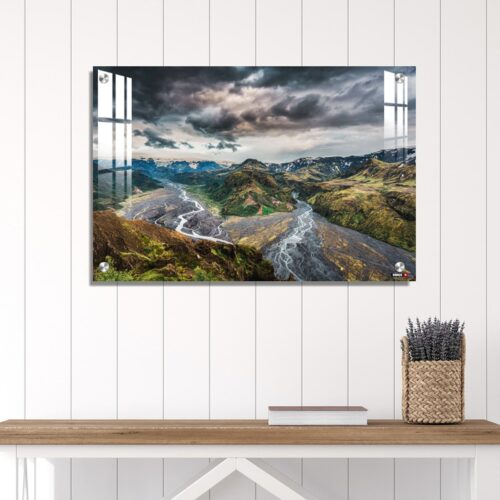 Acrylic Wall Decor – Valahnukur Viewpoint Hiking Trail With Mountain Valley and Krossa River in icelandic Highlands at Thorsmork, Iceland